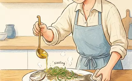 5. 將已燒熱的油,從魚頭到魚尾,快速而均勻地淋在蔥絲和薑絲上,此時會聽到悅耳的「滋滋」聲,並聞到撲鼻的香氣。