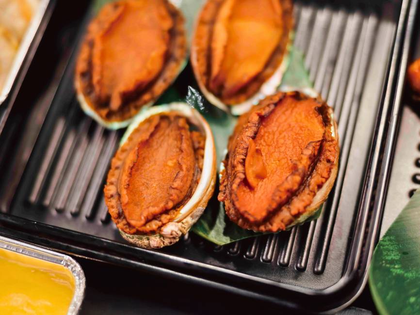 - 任食海鮮:甲羅燒、三文魚鰭、雞泡魚乾、白鱔、磯煮鮑魚