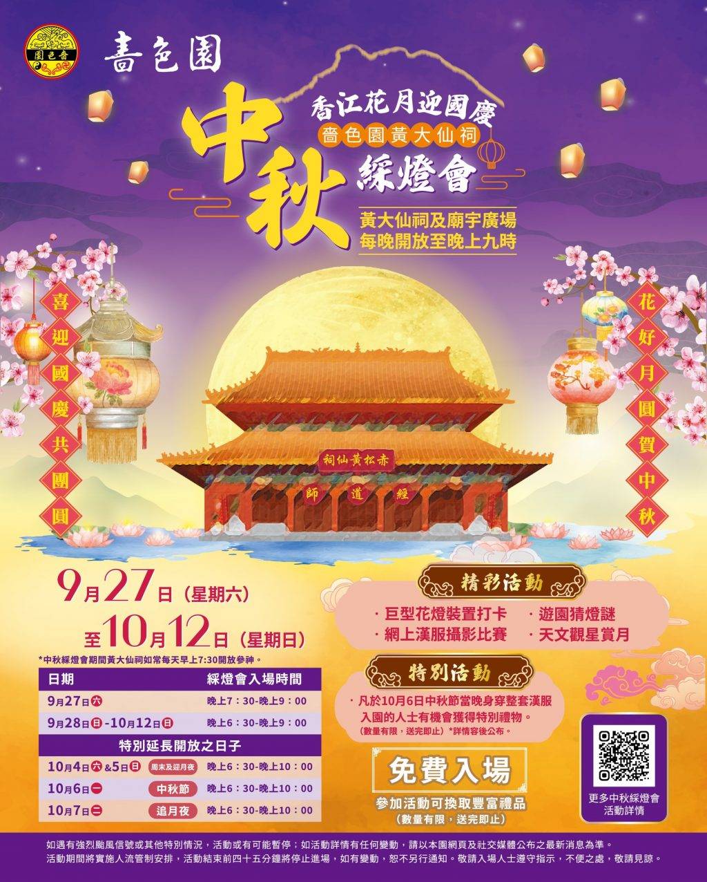 *中秋綵燈會期間大仙祠如常每天早上7:30開放參神。