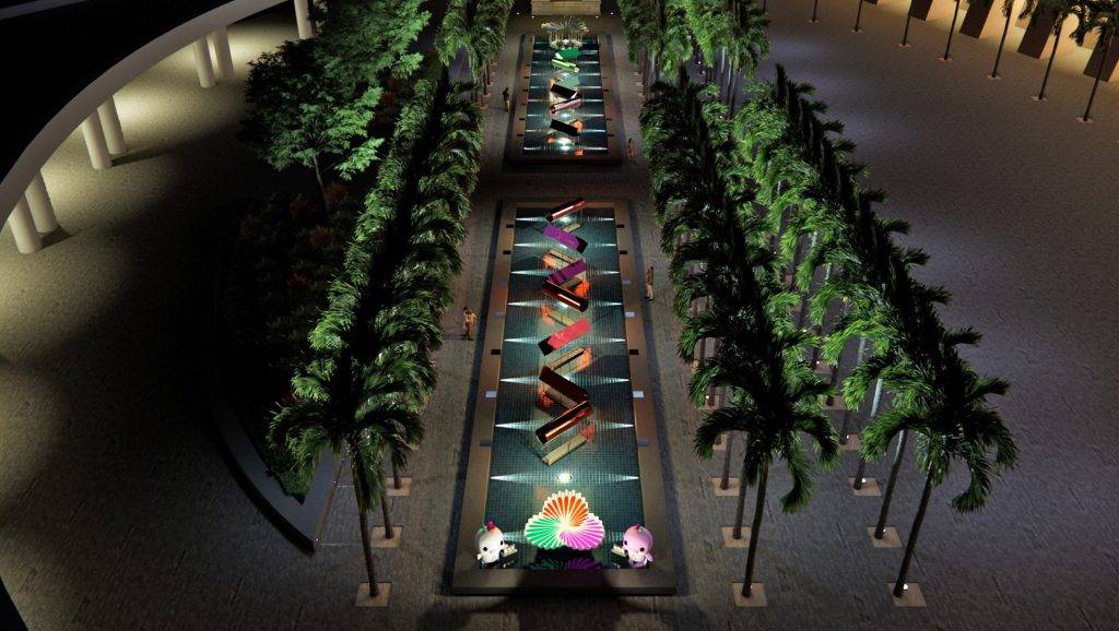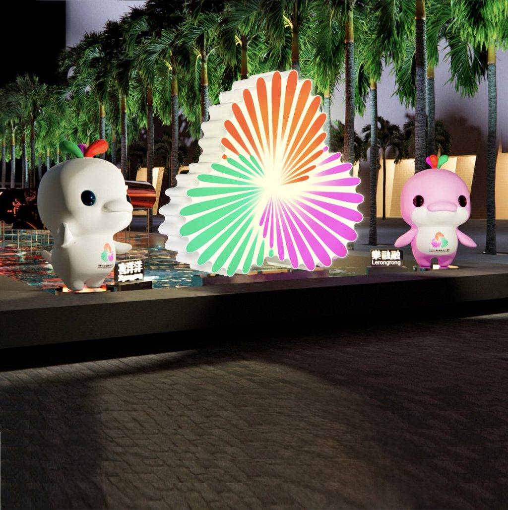 利用層疊雕刻工藝與光影動態技術,十五運會和殘特奧會其中13個運動項目的圖標,在圓形、三角形及菱形的鏡面燈箱中閃耀和舞動,生動地演繹運動的節奏感和動態美。火炬在水面化成漂浮的大型金屬花瓣,結合流動光影效果,宛如在空中綻放的煙花,象徵無窮活力、喜慶歡騰與世界共融。一場融合藝術與運動的視覺盛宴,在水面上華麗綻放!