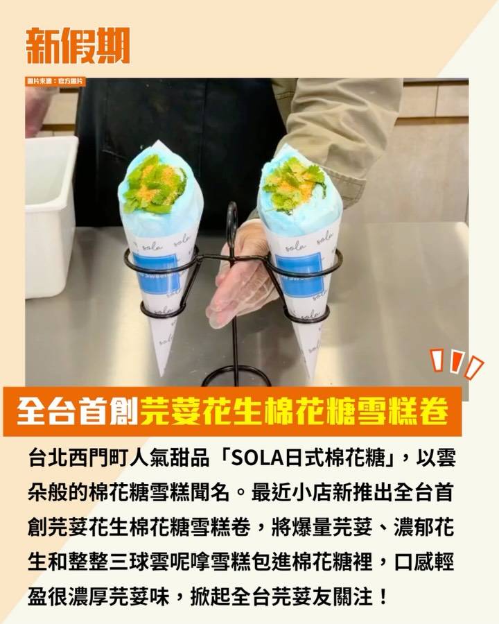 台北西門町人氣甜品「SOLA日式棉花糖」,以雲朵般的棉花糖雪糕聞名。最近小店新推出全台首創芫荽花生棉花糖雪糕卷,將爆量芫荽、濃郁花生和整整三球雲呢嗱雪糕包進棉花糖裡,口感輕盈很濃厚芫荽味,掀起全台芫荽友關注!