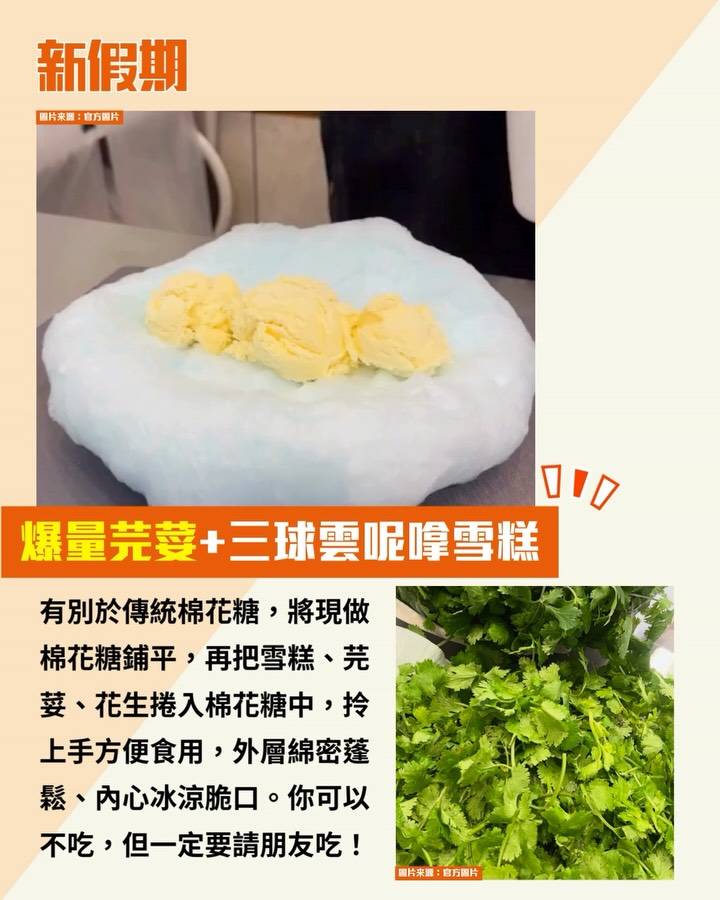 有別於傳統棉花糖,將現做棉花糖鋪平,再把雪糕、芫荽、花生捲入棉花糖中,拎上手方便食用,外層綿密蓬鬆、內心冰涼脆口。你可以不吃,但一定要請朋友吃!