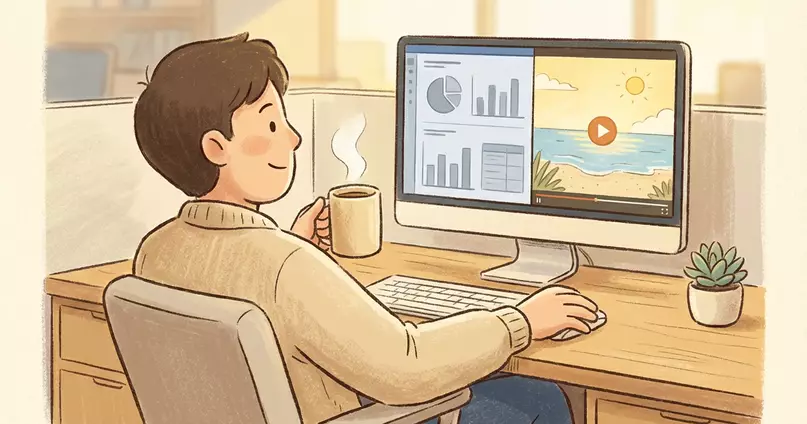 對於擁有寬螢幕的打工仔來說,「螢幕分割」是天賜的利器。Windows 系統內建了強大的視窗貼齊功能。你可以按住 Win + 左/右方向鍵,將當前視窗快速貼齊到螢幕的左半邊或右半邊。然後,系統會自動在另一邊顯示其他已開啟的視窗供你選擇。你可以將螢幕一半設置為工作用的 Excel 表格,另一半則用來瀏覽網頁或與朋友聊天。這種「一心二用」的佈局,會讓人覺得你只是在高效地進行多工處理,是個非常實用的進階技巧。