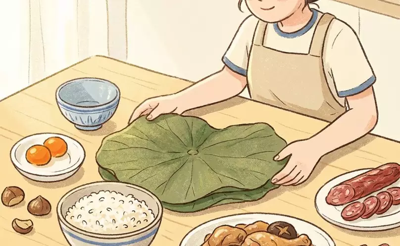 乾荷葉是香氣的主要來源。使用前需用溫水浸泡至軟,並用乾淨的布擦洗乾淨。為了最大程度地激發其香氣,可以在包裹前將荷葉放入滾水中略為汆燙幾秒鐘。包裹時,確保荷葉能完全覆蓋所有餡料和糯米,這樣在蒸煮時,水蒸氣才能將荷葉的清香緊緊鎖在其中。