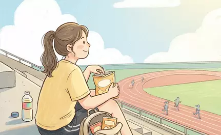 如果說陸運會是學生的嘉年華,那塞滿零食的書包就是入場的必需品。薯片、糖果、朱古力、汽水……各種平時在小食部被視為「禁品」的零食,在這一天都變得理所當然。最有趣的畫面,莫過於看台上的「零食傳遞鏈」。一包薯片從看台的最高處,經過數十雙手,小心翼翼地傳到最前排的同學手中。大家互相交換、分享,整個看台彷彿變成了一個大型的戶外野餐會,食物的香氣混合著青春的氣息,成為獨特的陸運會味道。