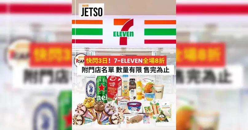 7-Eleven便利店推出「全場8折」限時優惠強勢回歸,由今日(3月12日)早上7時開始至3月14日,一連三日於指定分店舉辦快閃優惠活動。顧客只需於指定7-Eleven店舖或透過7仔App「到店自取」功能,買滿$100即可享受全單8折優惠。今次優惠涵蓋範圍相當廣泛,包括全店飲品、零食、啤酒、7-Select食品、即食麵、雪糕等熱門商品,絕對是開工返學季囤貨的最佳時機。