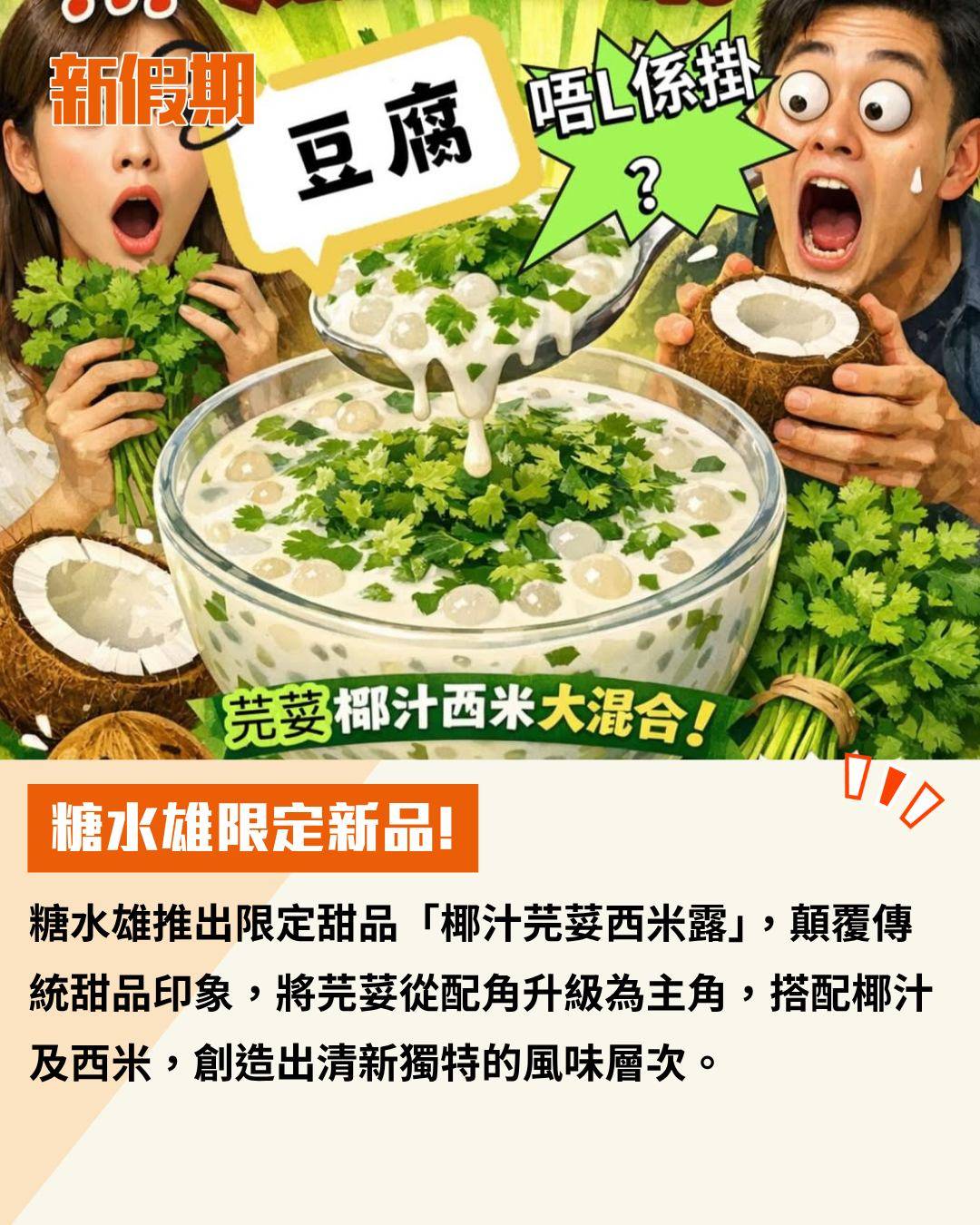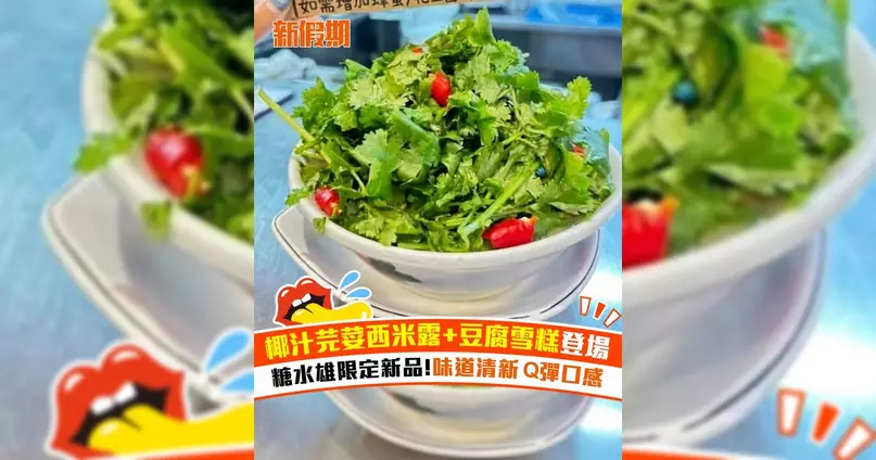 糖水雄推出限定甜品「椰汁芫荽西米露」,顛覆傳統甜品印象,將芫荽從配角升級為主角,搭配椰汁及西米,創造出清新獨特的風味層次。