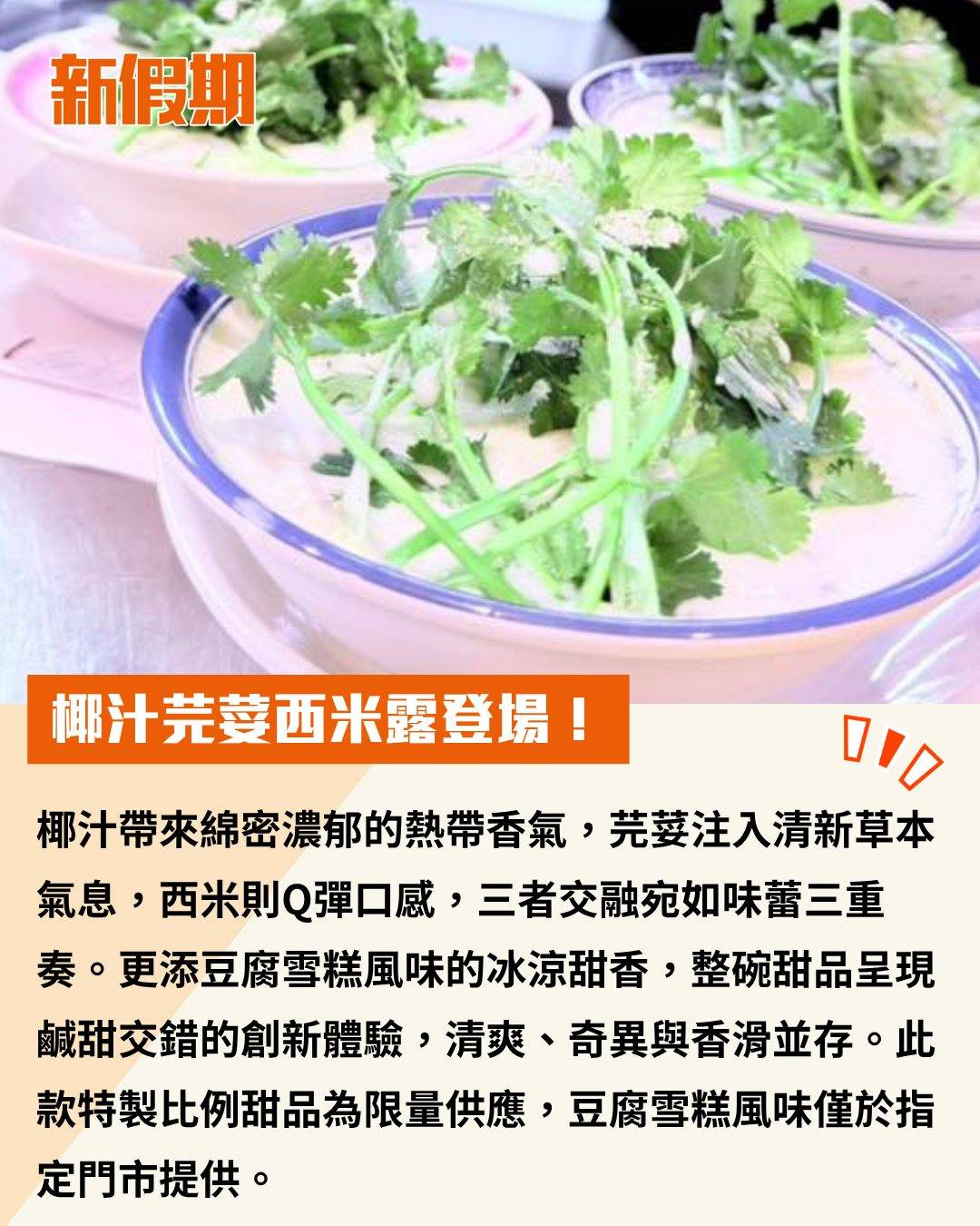 椰汁帶來綿密濃郁的熱帶香氣,芫荽注入清新草本氣息,西米則Q彈口感,三者交融宛如味蕾三重奏。更添豆腐雪糕風味的冰涼甜香,整碗甜品呈現鹹甜交錯的創新體驗,清爽、奇異與香滑並存。此款特製比例甜品為限量供應,豆腐雪糕風味僅於指定門市提供。