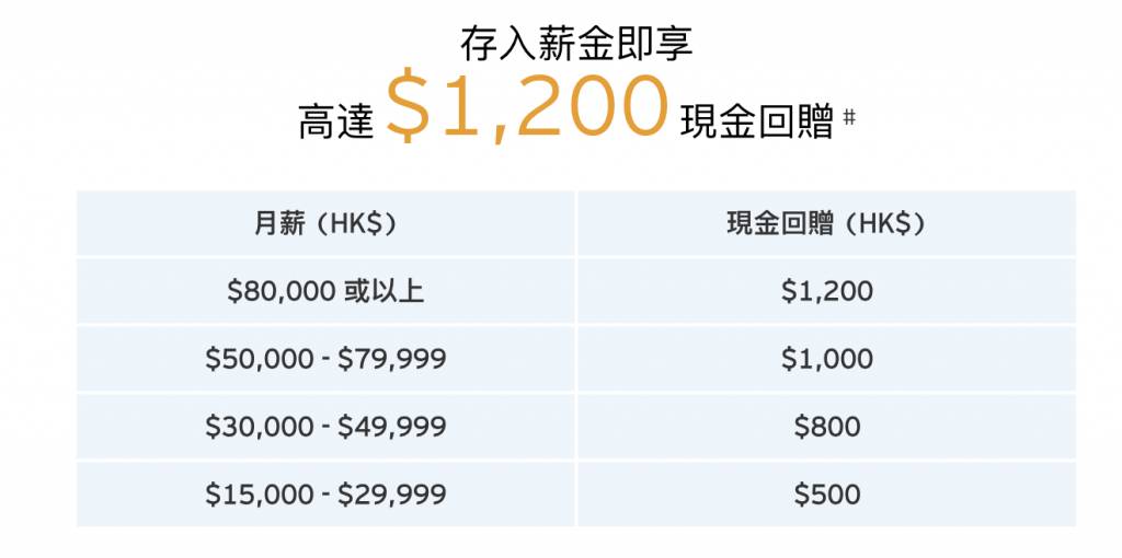 花旗銀行鎖定高薪專業人士,其 $80,000 的月薪要求為全港最高,對應為 $1,200 的迎新現金回贈。相比之下,中信銀行的「出糧 plus」方案則更具彈性。