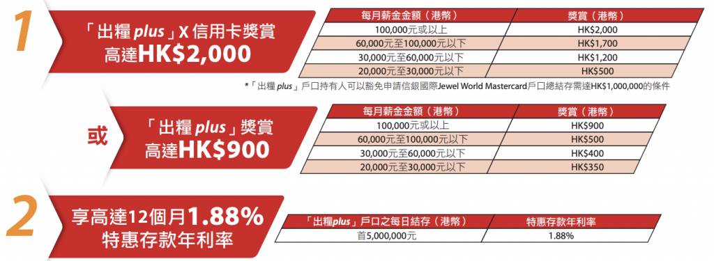 中信提供高達 $2,000 的獎賞且月薪要求僅為 $20,000 起,並配合高達 5.08% 的額外儲蓄年利率。對於資產結存較多的人士,中信提供的首 $1,000,000 結存均可享高息的政策,顯著優於其他銀行較窄的高息覆蓋範圍。