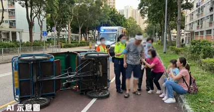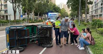 屯門兆康路單車徑今午發生一宗令人心痛的意外,一家三口原本開心地踩著三輪車享受親子時光,豈料樂極生悲,三輪車突然失控翻側,導致一家人受傷送院。現場畫面顯示,男事主頭部流血不止,情況令人擔憂,而這起意外的成因更是讓人意想不到。