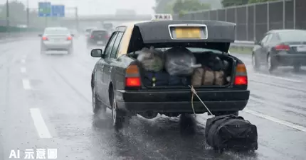 從車cam片段可見,該輛的士在濕滑路面上飛快馳騁,但由於乘客行李過多,車尾箱根本無法合上,司機只能用繩子勉強加固。然而防護措施明顯不足,一個黑色旅行袋最終跌出車外,在公路上被高速拖行。整個過程十分驚險,一旦行李完全脫落在路中央,隨時會對其他駕駛者造成嚴重危險。
