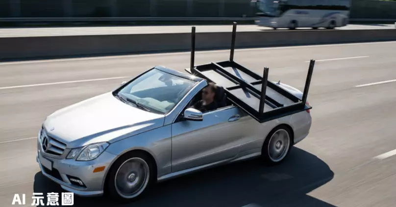 一段車cam片段近日在社交平台瘋傳,畫面顯示一輛平治開蓬車在公路上行駛時,後座竟然載著一個巨型鐵架,四隻鐵腳朝天並大面積伸出車廂外。這個驚人畫面不僅讓網民直呼離譜,更有人戲稱這是「Gogoben」服務,諷刺車主為了省錢而做出危險行為。