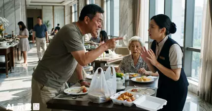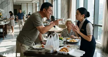 江蘇一對母子在五星級酒店享用自助早餐時,竟然自備膠袋和餐盒準備打包食物,當女職員禮貌提醒不能打包時,兒子瞬間暴怒狂毆對方,更理直氣壯地咆哮要求道歉。這段長達3分鐘的衝突影片在微博瘋傳,男子的離譜行為引發網民公憤。