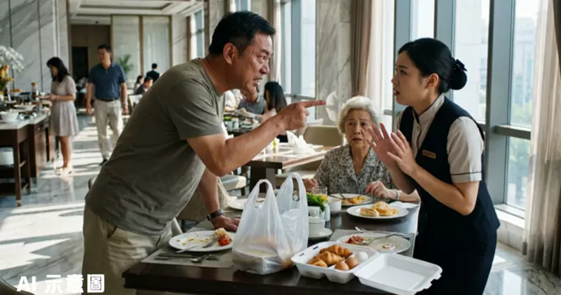微博帳號「藍色的煙捲」發布的影片顯示,當日早上9時半,一名男子與80多歲母親到酒店吃自助早餐。用餐期間,男子竟然取出自備的膠袋和餐盒,開始將食物裝進容器準備帶走。由於餐廳門口已貼上「早餐不提供食品打包服務」的告示,女職員見狀立即上前,以親切語氣向老人家說「阿姨,我們這裏不能打包」。