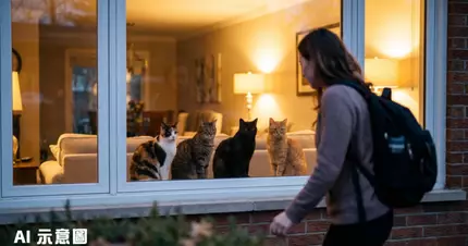 該名女飼主在TikTok帳號「thetoebeanarchives」分享了這個溫馨時刻,她透露自己工作一整天後拖著疲憊身軀回家,卻意外發現家中6隻貓咪整齊地坐在二樓窗台前。這些不同大小、不同品種的貓咪一同望向屋外,彷彿一直在耐心等待主人歸來。她感動地配上標題「When you return home and see them waiting for you」,並表示「這世上沒有比起回家時,看到一群貓咪正在熱切等著你更美好的事」。