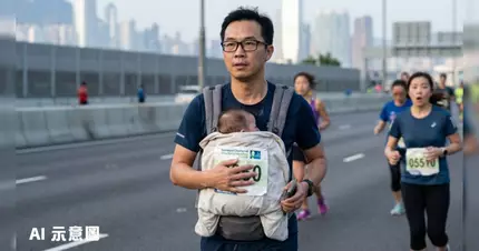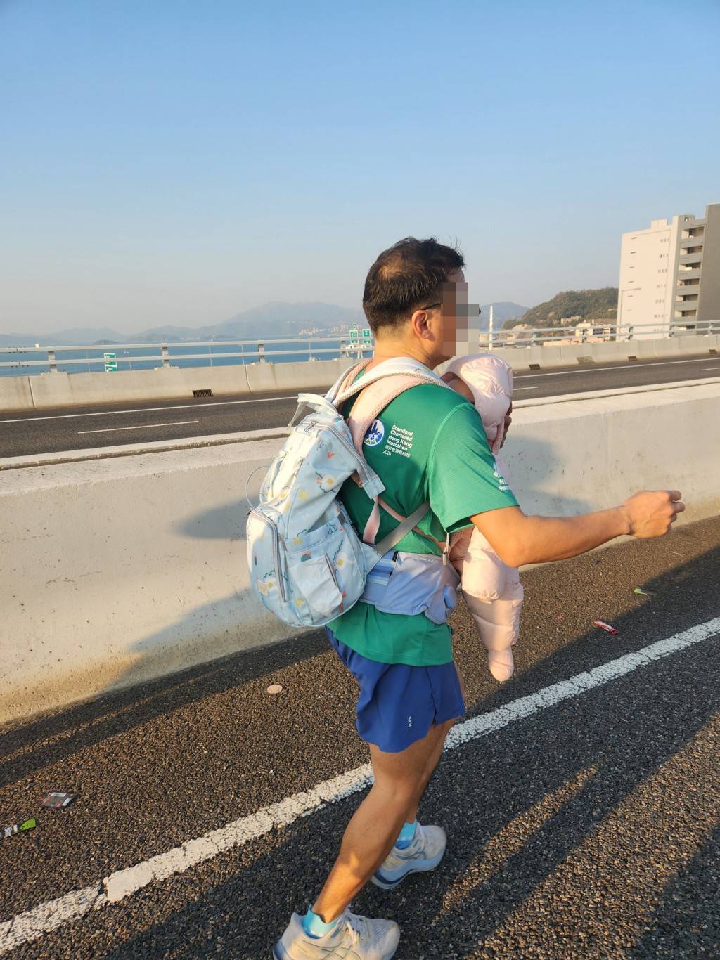 社交媒體Threads瘋傳的影片顯示,一名戴眼鏡、右手持手機的中年男子,身處西九龍公路近海盈邨路段,正跑往昂船洲方向。最令人咋舌的是,他後孭背囊,前孭嬰兒,更將參賽號碼布直接扣在嬰兒的防風被上。雖然該男子跑速不快,亦有用左手托住嬰兒的後頸,但裹在防風被內的嬰兒全程都在上下搖晃,路經的其他跑手紛紛側目或扭頭探看這個奇特景象。有目擊跑手透露,該男子參加的是全馬賽事,並指嬰兒目測不會大過6個月大。