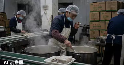 根據調查影片顯示,位於四川南充的生產車間內出現多項嚴重違規操作。工人在蒸煮牛肚過程中竟然肆意抽煙,完全無視基本的食品安全守則。更令人作嘔的是,剛出鍋的牛肚被直接堆放在破損不堪的環氧樹脂地面上進行冷卻,隨後工人竟用工業鏟子直接從地上將牛肚剷起裝桶。此外,該工廠還被爆出在泡發過程中涉嫌違規添加雙氧水,以追求牛肚的色澤與質感,整個生產環境令人觸目驚心。