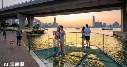 東岸板道東段引入多項創新設施,其中最矚目的要數體驗式玻璃觀景台。遊人可以站在透明玻璃上,以全新角度俯瞰維港海面,感受腳下波光粼粼的震撼視覺效果。觀景台每日上午10時至下午6時開放,為確保安全和玻璃耐用性,入場人士必須穿上場地提供的鞋套。此外,板道還設有寵物友善區,位於電照街附近,歡迎市民攜帶牽繩寵物同遊,區內更設有多用途室及小食亭,預計2026年首季啟用。