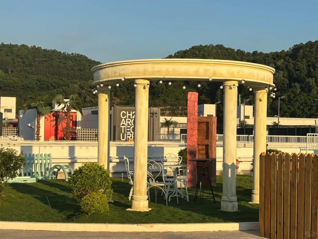歐式古典區:羅馬柱與白色建築還原聖托里尼風情,逆光拍攝搭配草帽造型格外浪漫。