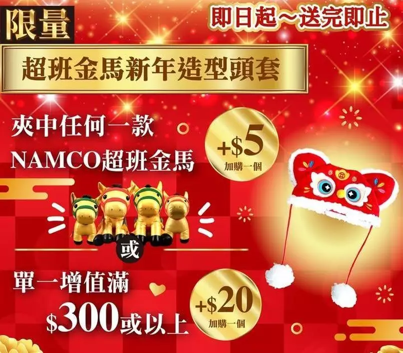 夾中任何一款NAMCO超班金馬 +💰5蚊 即可換購「超班金馬新年造型頭套」一個 ✨