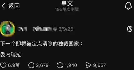事件發生後,大批網民翻出一則早於2025年9月發布在Threads上的帖文。該名網民當時預言「下一個即將被定點清除的獨裁國家是委內瑞拉」;結果2026年1月,美軍果然突擊委內瑞拉並活捉馬杜羅,令帖文瞬間爆紅。更令人震驚的是,樓主曾於1月4日回覆留言時指出,下一個出事的國家將是伊朗。未料2月28日,美以聯軍果然空襲德黑蘭,導致哈梅內伊身亡,預言再度「神命中」。