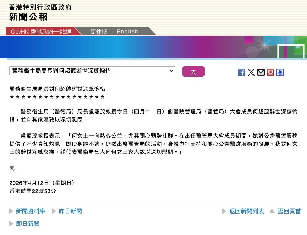 「醫務衞生局(醫衞局)局長盧寵茂教授今日(四月十二日)對醫院管理局(醫管局)大會成員何超蕸辭世深感惋惜,並向其家屬致以深切慰問。」
