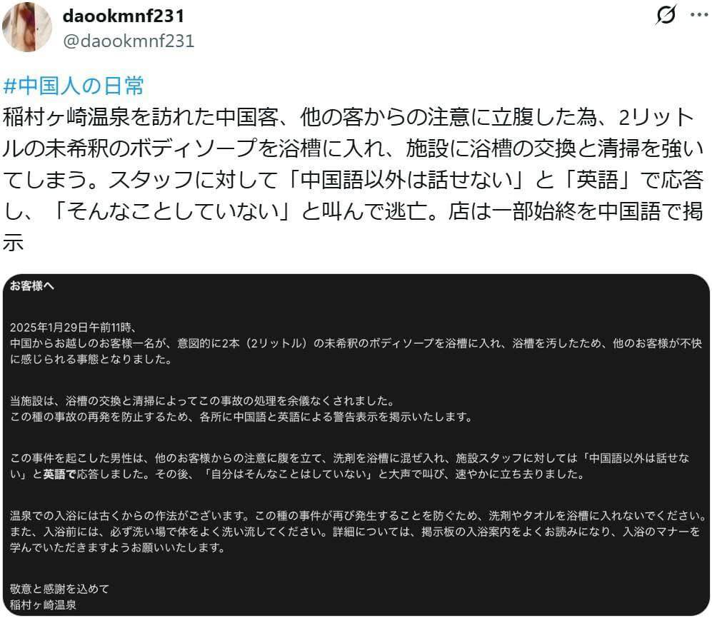 根據溫泉店方的告示內容,當工作人員發現異狀並上前與該名中國旅客對質時,對方竟以英文回答「只會說中文」,隨即更大喊「沒有做那種事」後,便拒絕承擔任何責任並迅速逃離現場。店方在告示中無奈表示,事件令其他顧客感到非常不舒服,為了防止同類事件再次發生,決定在各處張貼中、英文警告標示,並強調溫泉沐浴有古老的禮儀,希望客人務必在浸泡前先徹底沖洗身體,切勿將沐浴乳或毛巾帶入浴池。