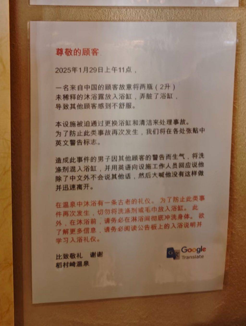 有日本網民近日到訪鎌倉的稻村崎溫泉時,發現店內張貼了一張簡體中文告示,才揭發這宗駭人事件。告示上詳細列明,在今年1月29日上午約11時,一名中國旅客因被其他客人提醒要注意溫泉禮儀而感到憤怒,竟然將容量達2公升的沐浴乳全部倒入浴池中,導致整個溫泉池充滿泡沫,嚴重影響其他客人。店方為此不得不將整個浴池的水放掉,並進行徹底清洗和消毒,造成極大困擾與損失。