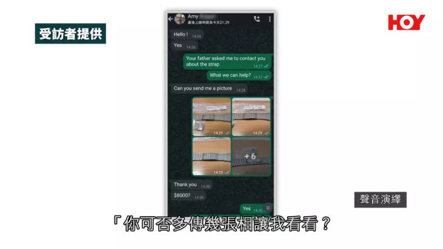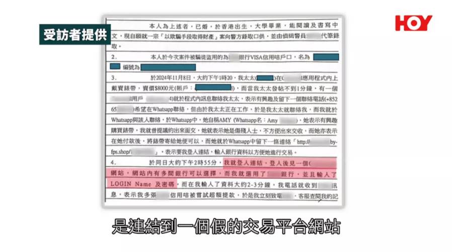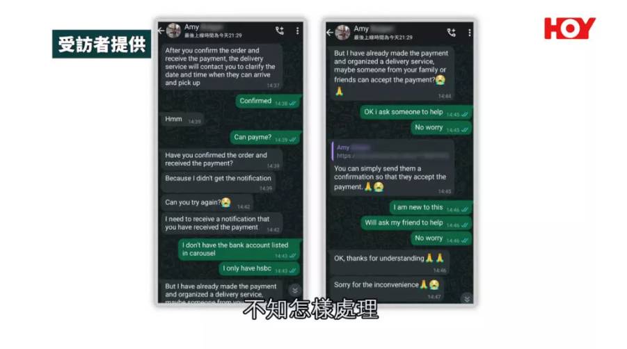 根據HOY TV節目《一線搜查》報導,事主唐先生的太太早前在網上買賣平台,以8,000元放售一條原價逾13,000元的錶帶。帖文發出不足一分鐘,即有買家以英文私訊,聲稱對貨品極感興趣,並派出所謂的「女兒Amy」接洽。該名Amy在WhatsApp中自稱是殘疾人士,行動不便,頭像更是一名坐著輪椅的女子。當唐先生提出現金交收時,Amy便以殘疾為由博取同情,堅持要安排速遞上門取貨,並提供一條付款連結要求唐先生收款。雖然唐先生初時有所懷疑,但最終因一時心軟,不虞有詐便點擊了該連結。誰知該網站是偽冒的交易平台,在他輸入銀行戶口及密碼後短短兩三分鐘,便隨即收到銀行短訊,通知其信用卡已被透支,驚覺自己已墮入騙徒的陷阱。