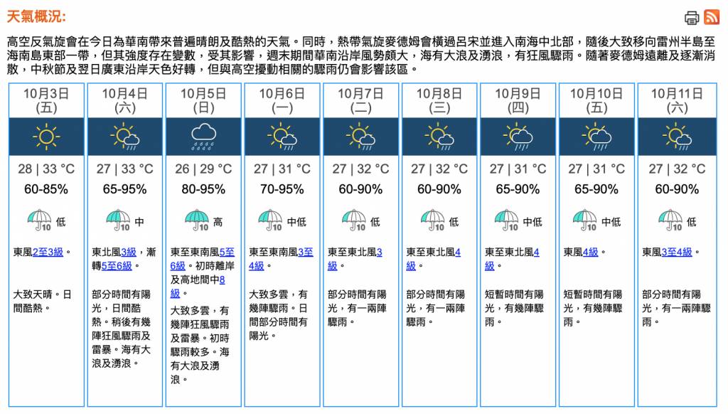 天文台表示會密切留意「麥德姆」的動向,並會考慮在明日(3日)晚間發出一號戒備信號,提醒市民及早做好防風措施。天文台指出,會視乎「麥德姆」與珠江口的距離、其強度及本地風力變化,評估是否需要在星期六(4日)日間改發更高熱帶氣旋警告信號。預料本港風勢將在周末顯著增強,周六漸吹5至6級東北風,到周日(5日)更會吹東至東南風5至6級,初時離岸及高地間中吹8級烈風,天氣將會是整個假期中最惡劣的時刻。