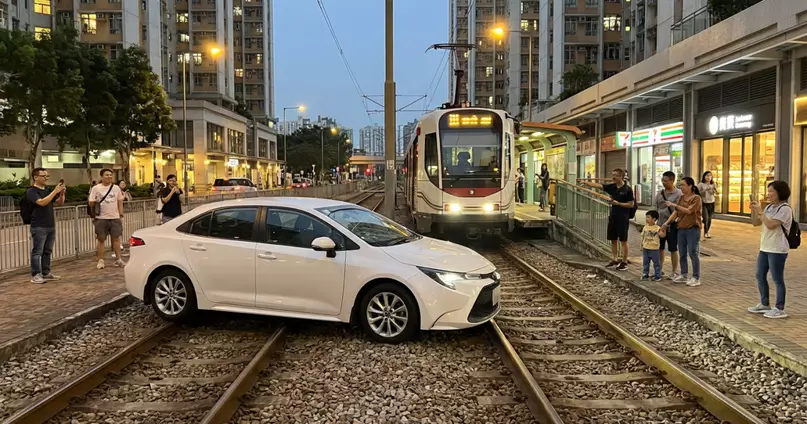 事發在昨晚約8時,網上流傳的兩段影片震撼全城。其中一段約10秒的影片可見,一輛白色私家車由青山公路與洪水橋大街交界處,直接駛入輕鐵路軌範圍,並沿著路軌向屯門方向行駛,車身因路軌上的石仔而劇烈顛簸。更驚險的是,影片中可見其前方不遠處就停著一輛輕鐵列車,情況一度非常危急。另一段約44秒的影片則顯示,該私家車在路軌上行駛約百米後,最終在一個分岔路口成功「逃脫」,駛回正常馬路,結束了這場路軌驚魂記。