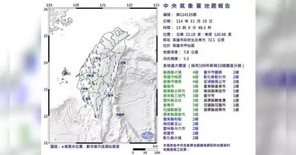 台灣高雄市甲仙區今日下午1時發生芮氏規模5.3地震,震央深度僅7.8公里,全台13個縣市有感。氣象署專家警告,這次地震屬於獨立事件,成因與菲律賓海板塊碰撞有關,未來3日內恐有規模4.5至5的餘震襲擊。