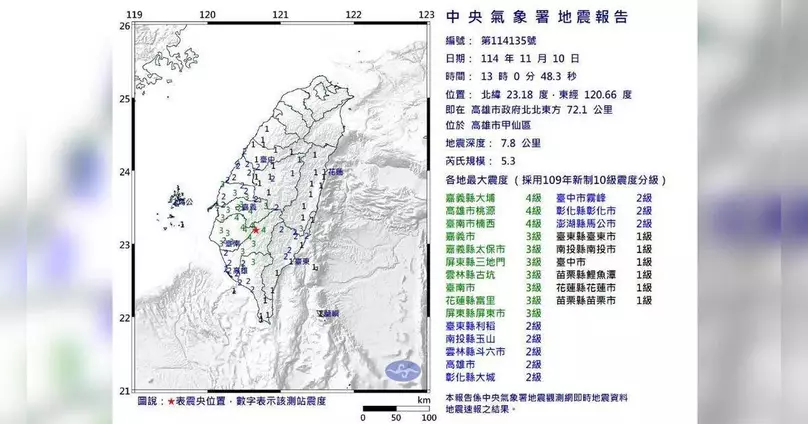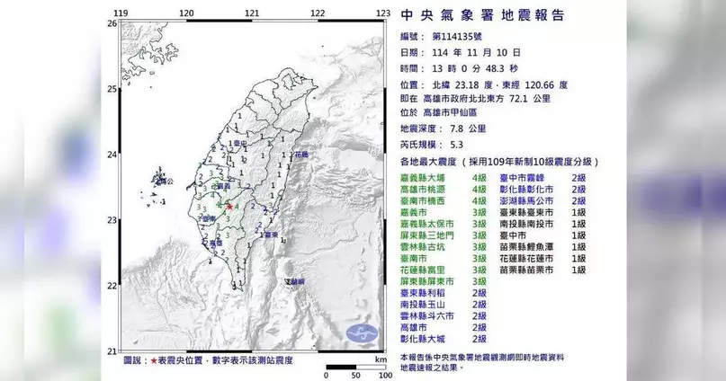根據台灣中央氣象署地震測報資訊,這次地震震央位於高雄市政府北北東方72.1公里處的甲仙區,芮氏規模達5.3級,震源深度僅7.8公里。由於震源相當淺層,地震威力集中,造成廣泛地區有感。最大震度4級地區包括嘉義縣、高雄市及台南市,震度3級地區涵蓋嘉義市、屏東縣、雲林縣及花蓮縣等地。震度2級地區則有台東縣、南投縣、彰化縣、台中市及澎湖縣,連苗栗縣都錄得1級震度,顯示地震影響範圍相當廣泛。