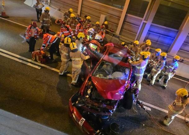 事發在昨天(10月5日)晚上大約七時,一輛載著一家三口的私家車,沿沙田大圍青沙公路往九龍方向行駛,駛至大圍隧道入口附近時突然失控,先是猛烈撞向路邊石壆及雪糕筒,繼而再撼向一輛停泊在路肩的重型拖車車尾。撞擊力極為強大,導致車上三人同告受傷,並被困在已成廢鐵的車廂內。