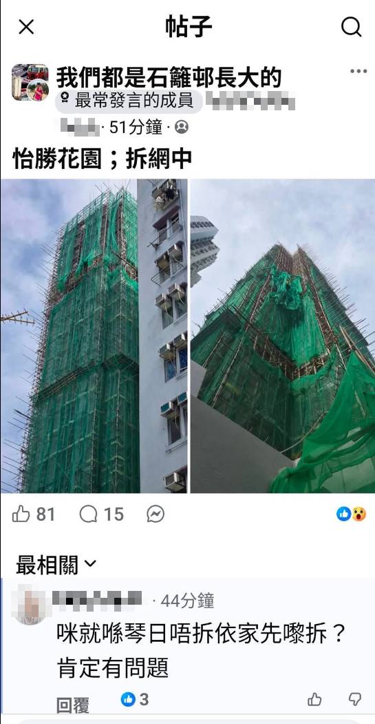 火災發生後不足24小時,全港多個屋苑今早被居民拍攝到正在拆除棚網,包括葵涌怡勝花園、屯門怡樂花園、黃埔等地的維修工程都出現拆網行動。網民在社交平台上紛紛上載相關照片,質疑這些承建商是「作賊心虛」,急於毀滅可能不合規格的證據。有網民直言「今日拆網的一定自己知自己事」,更有人呼籲住戶要「快手剪網留證」,記錄這些可疑行為。不少網民認為,如果棚網符合防火規格,根本不需要急於拆除,現在的行為明顯是「此地無銀三百兩」。
