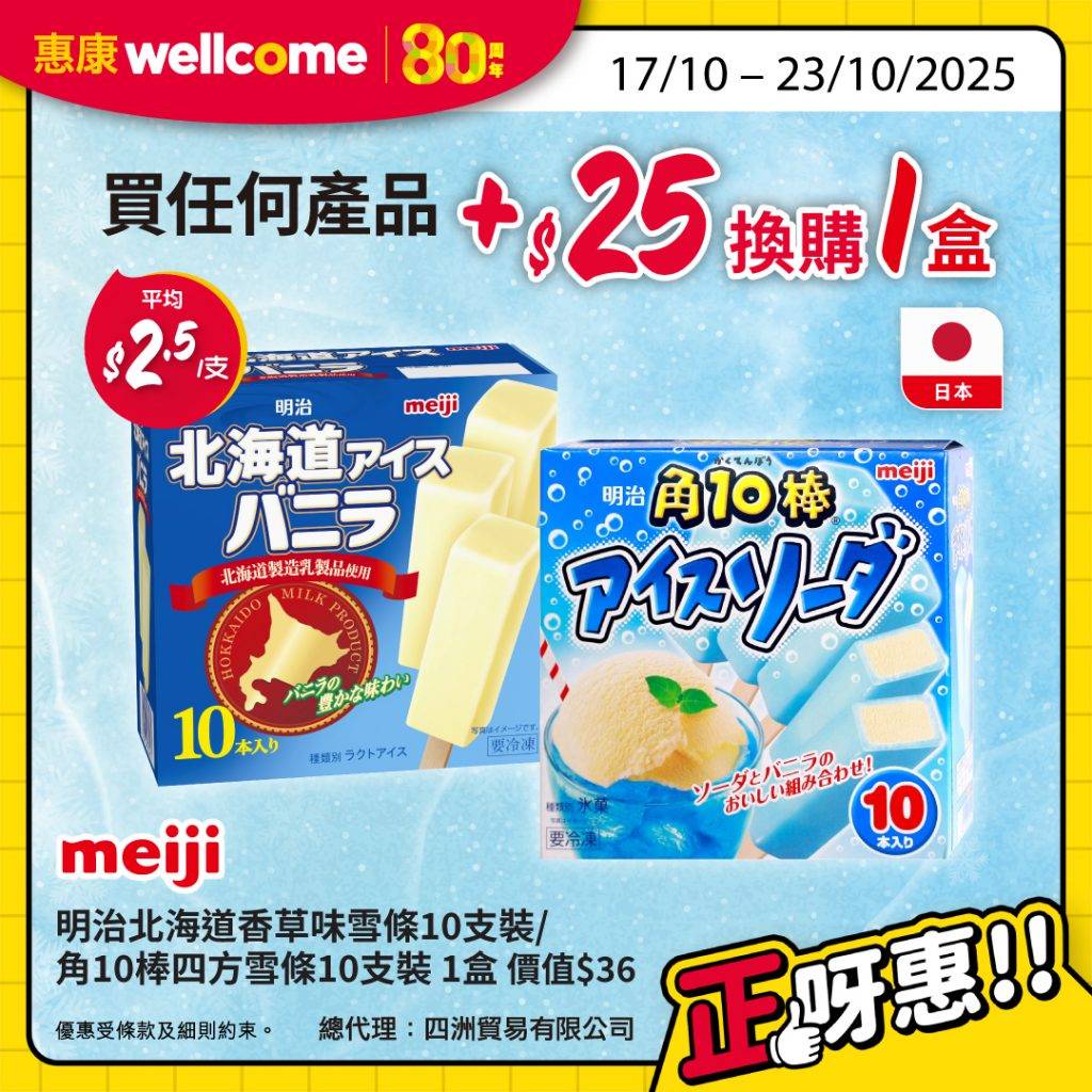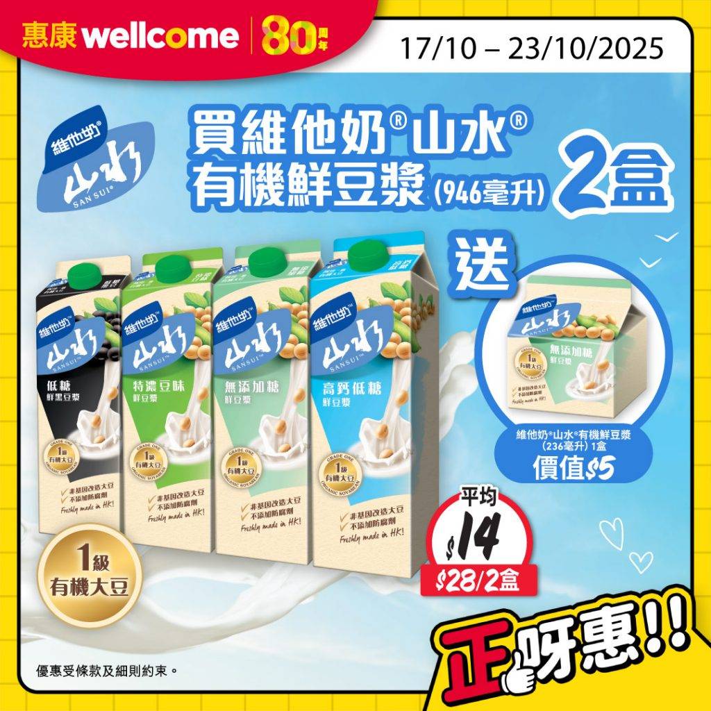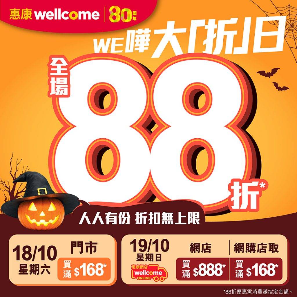 惠康舉行為期兩日的全場88折的優惠,這次活動於門市與網店分日進行,10月18日為門市限定日,顧客只需在全線惠康門市單次消費滿168元,即可享受全場88折優惠;翌日10月19日則為網店專屬日,網購消費滿888元或選擇「網購店取」滿168元,同樣可獲88折優惠。折扣沒有上限設定,消費者可盡情選購心儀商品。