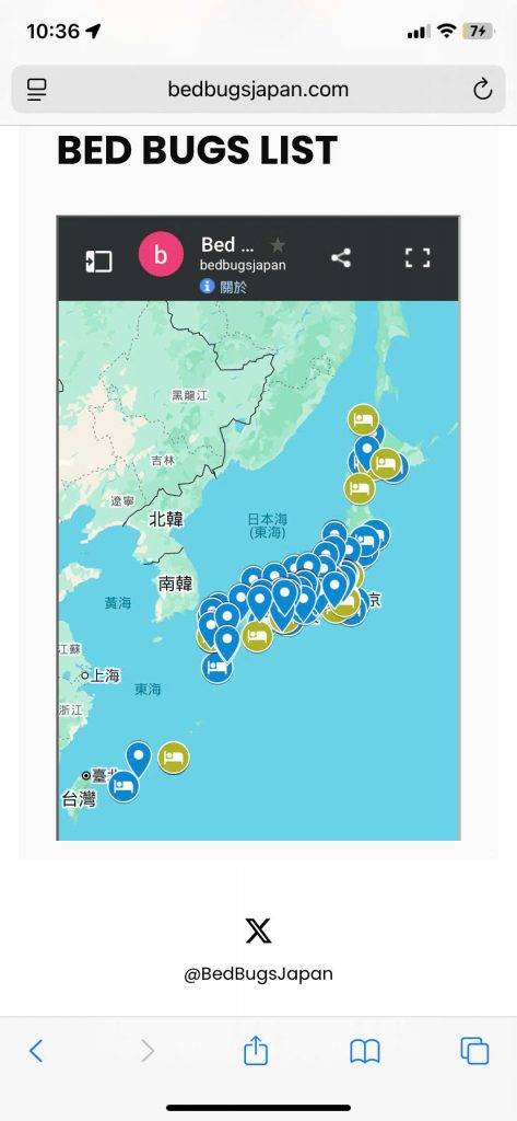 面對床蝨肆虐,有日本網友透過Google地圖製作神器「日本床蝨地圖」(BED BUGS JAPAN),詳細標示各地疑似出現床蝨案例的酒店或住宿設施,希望提醒海內外旅客提高警覺。地圖上不乏知名酒店,連五星級的大倉酒店在2023年也被回報過床蝨問題,令不少已預訂該酒店的旅客大感震驚。有網民在社交平台分享「我發現預訂的那家5星級酒店大倉在2023年也被回報過一次」,反映問題的嚴重性。