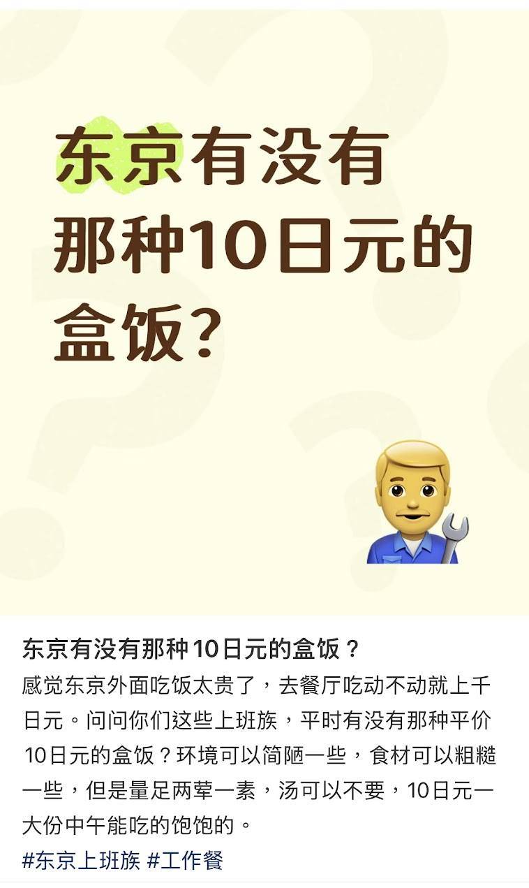 該名網民在社交平台發文表示,感覺東京外面吃飯太貴,去餐廳吃動輒就上千日圓,詢問其他上班族平時有沒有平價10日圓的便當選擇。他進一步說明要求,表示環境可以簡陋一些,食材可以粗糙一些,但希望量足夠,最好有兩葷一素,湯可以不要,10日圓一大份中午能吃得飽飽的。這個看似天真的詢問立即在網上引起軒然大波,吸引了二百多條留言回應。