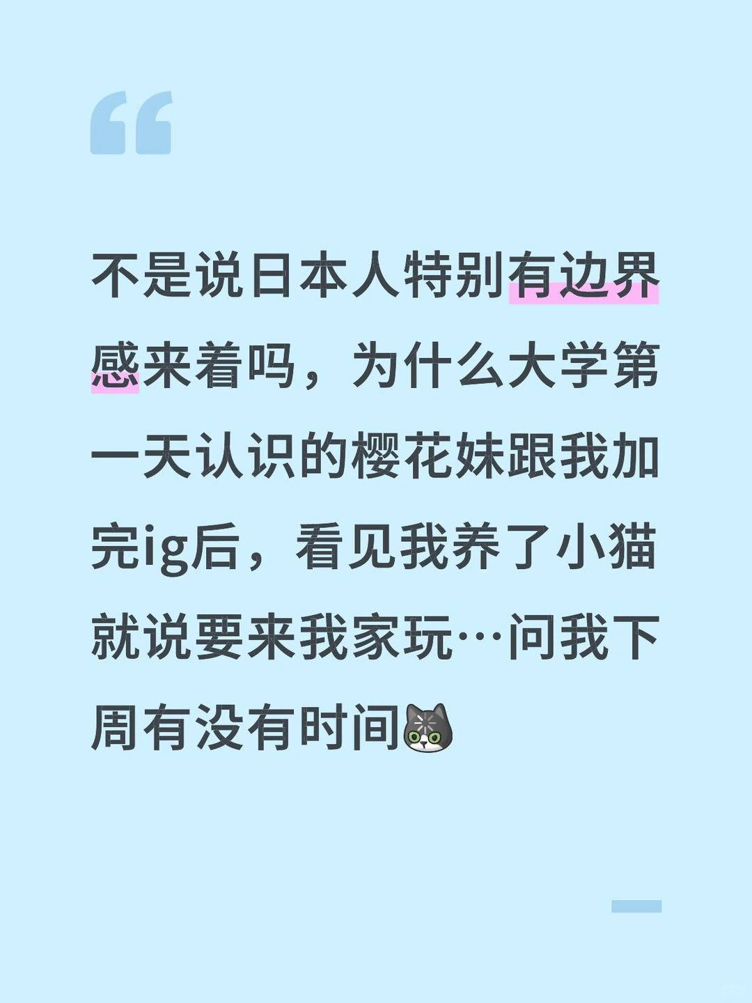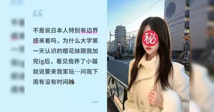 這名剛到日本的大一新生在社交平台發文表示,大學開學第一天認識了一名日本女同學,兩人剛交換完IG,對方看到事主養了小貓,竟然立刻提出想去她家玩,更不斷追問「下周有沒有時間」。這讓事主感到相當疑惑,直言:「不是說日本人特別有邊界感來著嗎?」她坦言自己雖然不反感,也覺得對方挺外向,但畢竟對方是日本人,這種初次見面就急著登門的社交節奏,實在讓她感到有點奇怪。