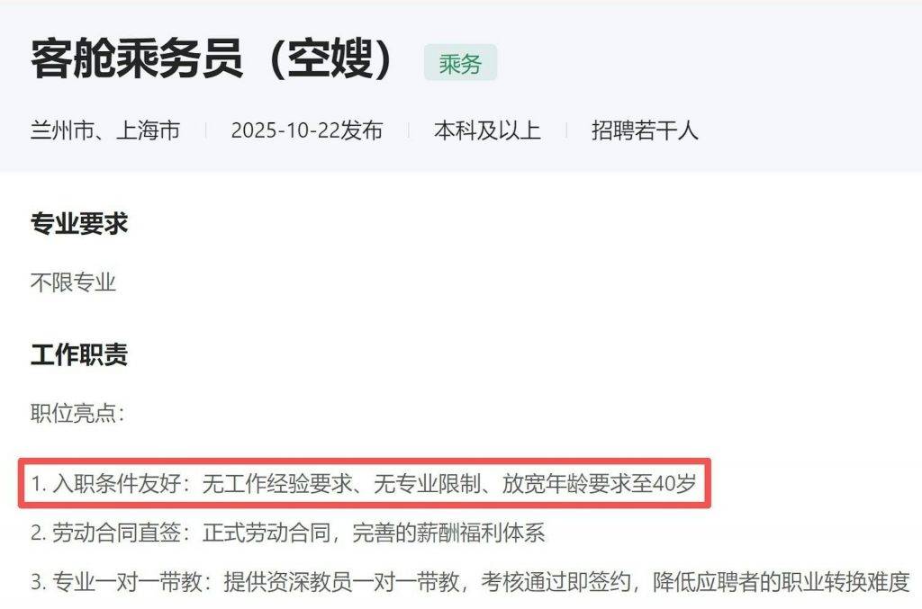 春秋航空發布的客艙乘務員(空嫂)蘭州專項招聘計劃顯示,招聘面向已婚已育女性,年齡放寬至40歲,身高要求為162cm-174cm,持全日制本科及以上學歷,無工作經驗要求、專業不限。招聘負責人表示,此舉預計招錄30至60人,於2026年初啟動培訓,當年形成運行實力,為公司蘭州基地和上海本部儲備人才。