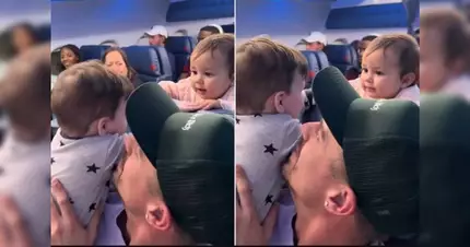 期間Taylor回頭觀察兒子動作時,Kingston似乎察覺爸爸的「注視」,隨即伸手拍打其臉龐,彷彿阻止他繼續「八卦」。這個舉動令Taylor哭笑不得,機艙內部分乘客亦留意到兩名嬰兒的有趣互動,不少人露出會心微笑。整個過程中,兩名嬰兒都表現得十分自然,沒有任何陌生感或恐懼,反而像是認識已久的好朋友一般。
