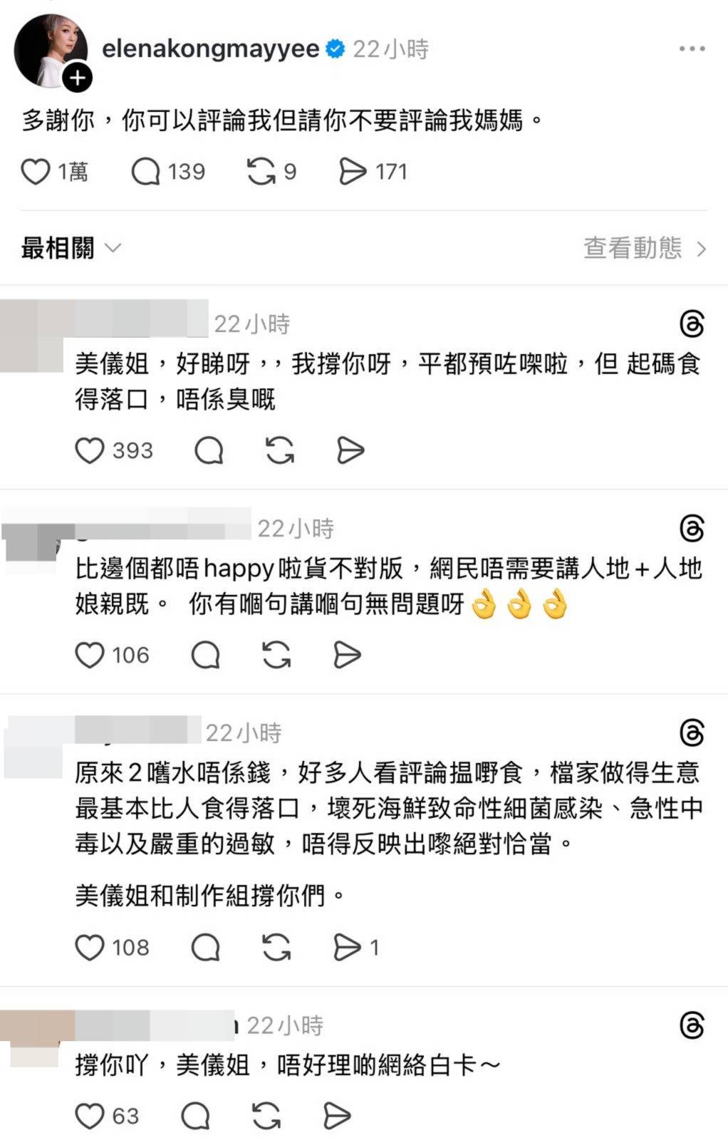 反對聲音則認為江美儀用詞過於刻薄,質疑以如此低價購買海鮮餐本身就不應抱有過高期望。不過,絕大部分網民都一致譴責涉及家人的人身攻擊言論,認為這種做法完全超越了正常討論的界線。