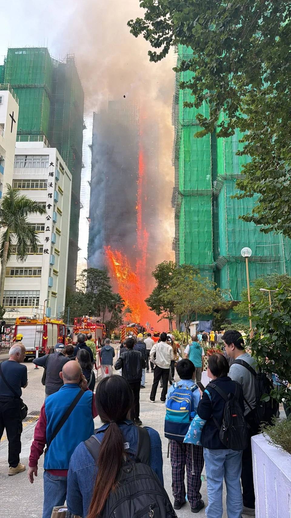 大埔宏福苑今午發生五級火警,外牆棚架陷入火海,多名居民被困求助,現場頻繁傳出爆炸聲響。消防員穿著「黃金戰衣」奮勇救火,惟有消防員全身熏黑昏迷送院,情況嚴重,現場不斷有被困市民求救,但火場環境惡劣、雜物頻頻墜落,加上入夜後能見度低,情況極為複雜,促使當局短時間內兩度提升火警級別,最終於晚上6時22分升為五級火警。