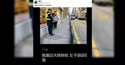 事發在11月23日下午約3時半,消防局及治安警察局同時接獲報案,指澳門雅廉訪大馬路近某大廈對開行人道發生疑似高空墮物事件,一名澳門居民被擊中受傷。消防員、救護員及治安警立即趕抵現場處理,發現一名年約40歲的本澳女居民頭部受傷,她向救護人員表示是被從高空跌落的餅乾擊中頭頂。救護員即時為女傷者檢視傷勢並進行治理,確認她意識清醒且情況穩定。