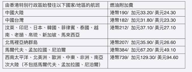 香港航空10日率先宣布,本周四(12日)起調整燃油附加費,當中最受港人歡迎的日本航線由162元大幅增至212元,加幅達30.9%。由日本飛返香港的費用則維持在7,000日元(約346港元)不變。同樣受歡迎的韓國、泰國航線同樣加價3成,而飛往歐美、澳洲等長途航線更由589元激增至739元,加幅高達25.5%。即使是內地航線也難逃加價命運,由185元增至190元。