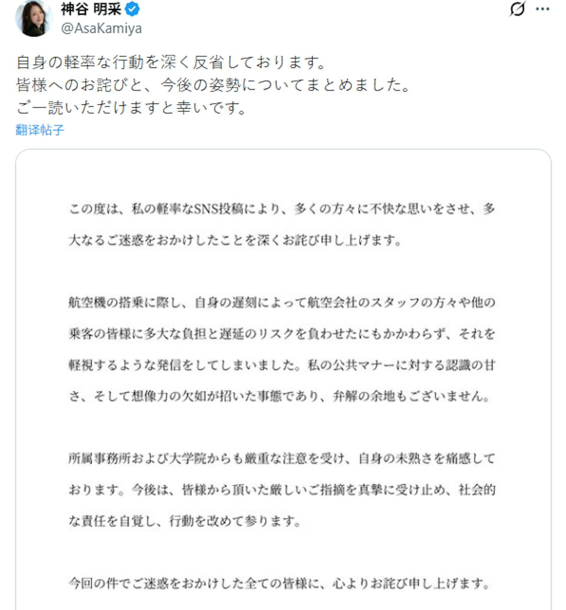 神谷明采隨後公開致歉,表示已對自身的「輕率行為」深切反省:「因為我的魯莽發文,給大眾帶來不快與麻煩,真的非常抱歉。」