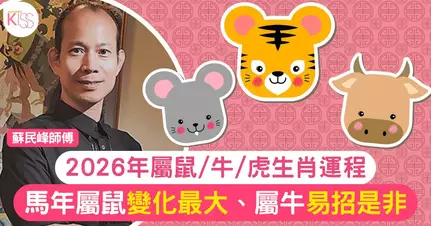 2026年對於屬鼠、牛、虎的朋友來說,變動會比較多。屬鼠是正沖太歲,屬牛則害太歲,這兩個生肖都要特別留意人際關係及身體損傷。至於屬虎雖然是三合年,但亦有五鬼纏身。所謂「一喜擋三災」,無喜是非來,今年心態最重要的是處變不驚,主動去應變。