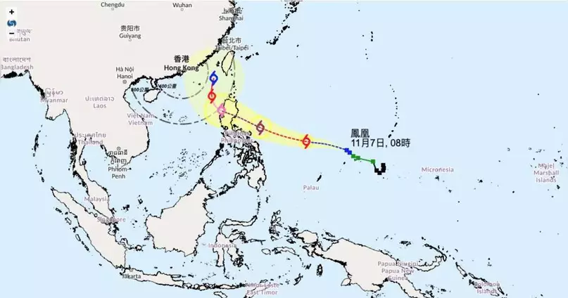 天文台表示,熱帶氣旋鳳凰今日正式增強為熱帶風暴級別,預料在未來數日會持續加強。根據最新預測,鳳凰將在周日(11月9日)達到超強颱風級別,並會以此強度橫掃菲律賓呂宋島。隨後鳳凰會進入南海東北部,有較大機會轉向偏北方向移動,大致移向台灣一帶。天文台指出,受下周初至中期的乾燥東北季候風影響,鳳凰會逐漸減弱,但轉向位置及減弱速度仍存在變數。