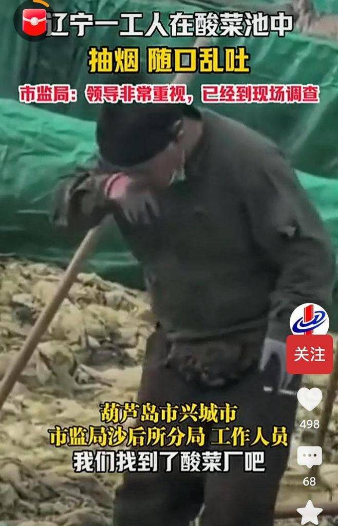 遼寧葫蘆島市一家酸菜廠近日被揭發駭人衛生醜聞,工人在醃製池邊工作時全程抽煙,更肆無忌憚地多次向池內吐痰,煙灰亦直接掉入酸菜中。相關影片在網上瘋傳後震驚全國,當地市場監管部門已火速介入調查。